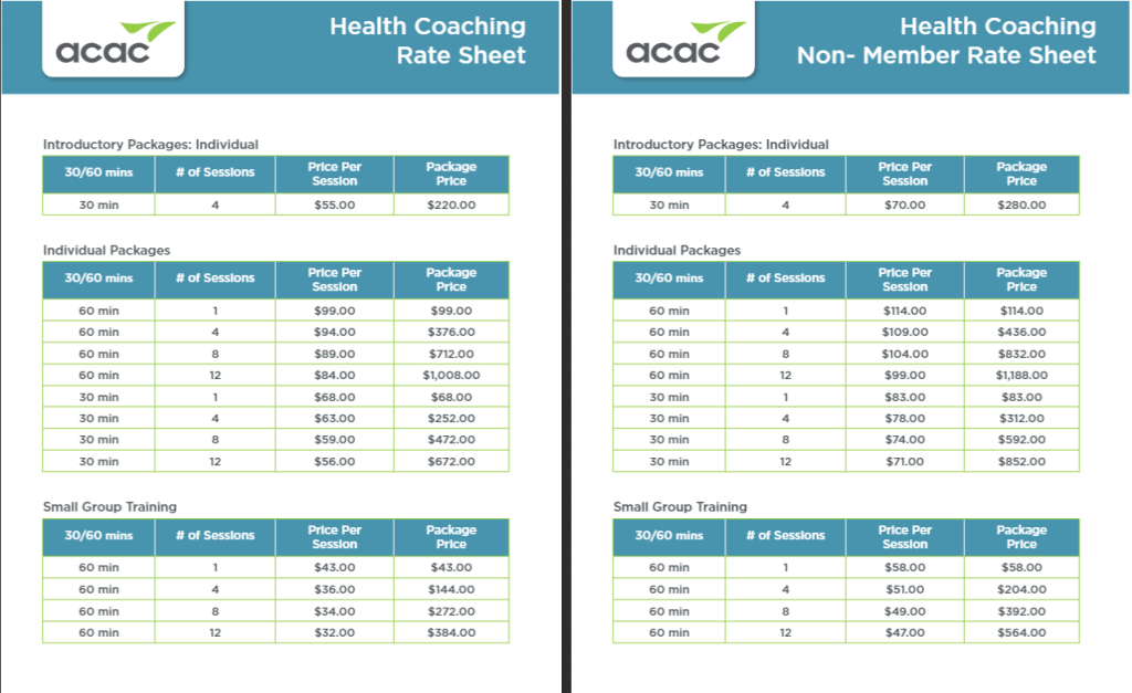 In-Person Training Prices These are the 2022 prices for in-person training and health/nutrition coaching at acac Charlottesville clubs for both acac members and non-members. These prices do not apply to other acac clubs. Share this: Click to share on X (Opens in new window) X Click to share on Facebook (Opens in new window) Facebook Click to share on Pinterest (Opens in new window) Pinterest Click to share on Tumblr (Opens in new window) Tumblr Click to print (Opens in new window) Print Click to email a link to a friend (Opens in new window) Email Like Loading...