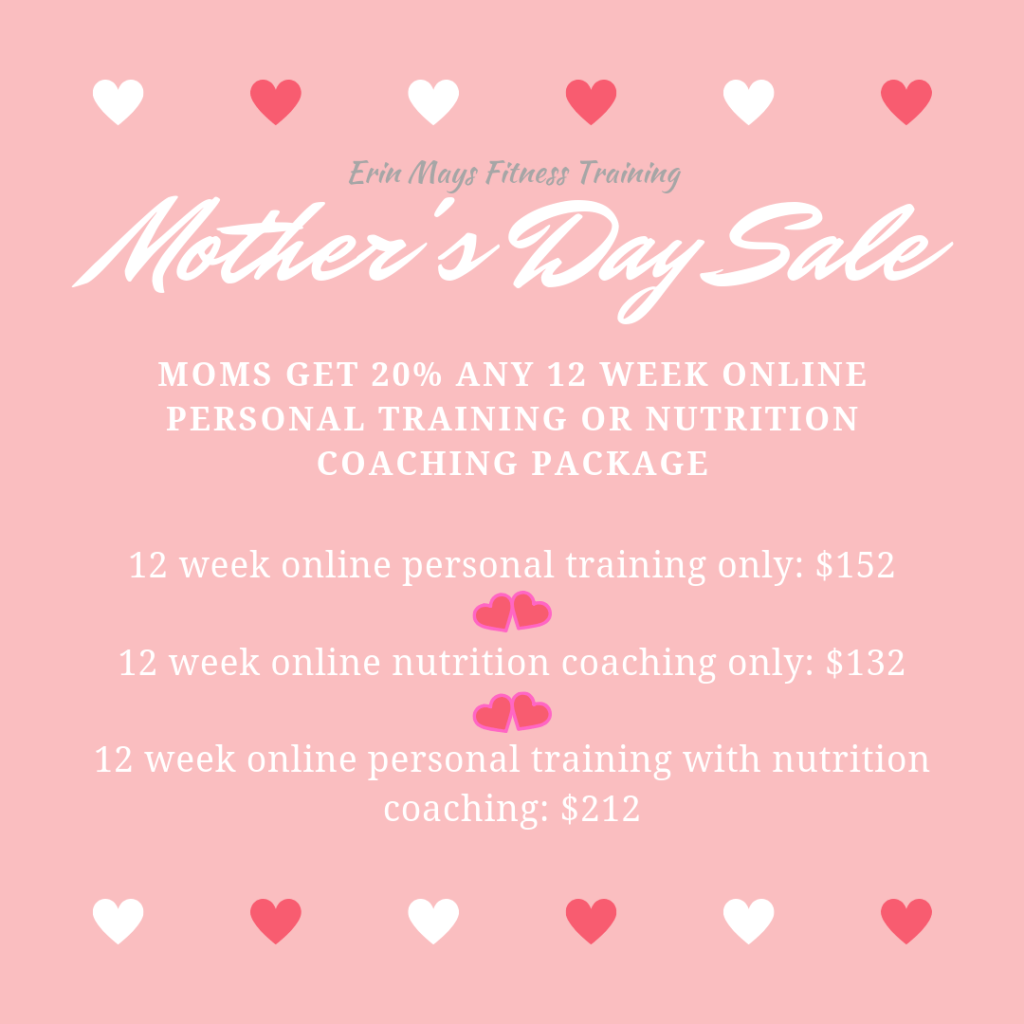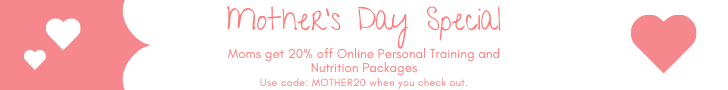 Mother’s Day is Sunday, May 12th. I hope you have already planned something special for the moms in your life, but don’t forget about the everlasting gift of better health – we want our moms to be around happy, healthy, fit, and strong, right? This Mother’s Day, if you are a mom, if you have a mom, or if you know a mom give them the gift of fitness with an online personal training or nutrition coaching package.